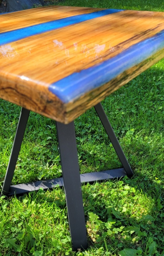 Stoliczek kawowy z drewna i żywicy o wymiarach 47 x 47 x 45cm. Unikalny, kompaktowy, pięknie prezentujący się. Nogi stalowe malowane proszkowo na kolor czarny. Blat zabezpieczony dwiema warstwami żywicy epoksydowej. Efektowny jak na zdjęciach!